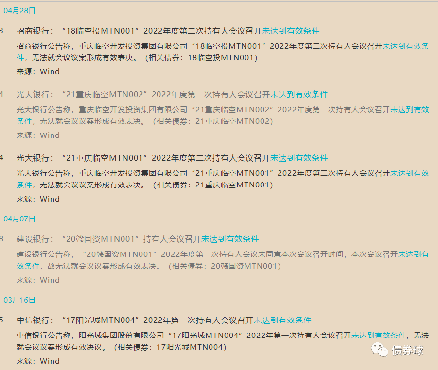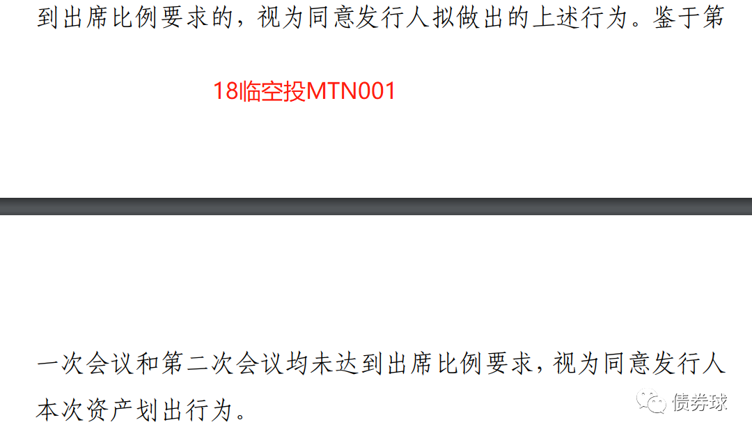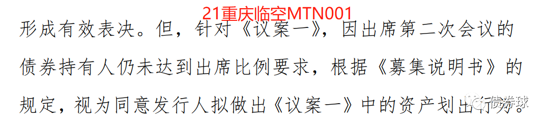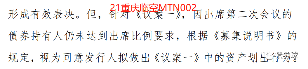 前兩天,重慶臨空因資產劃轉的事情, 18臨空投MTN001、21重慶臨空MTN001和21重慶臨空MTN002分別召開了持有人會議,并就持有人會議召開未達到有效條件進行了公告。協會產品就持有人會議召開未達到有效條件進行公告并非個例,但是在此前提下,個別議案依然可以執行卻較為少見。