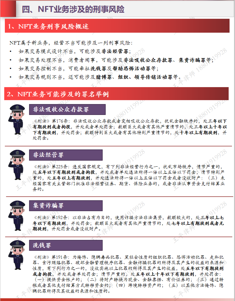 作為一個(gè)新興事物,法律規(guī)定尚屬于空白狀態(tài),我們?cè)趧?chuàng)新的同時(shí),更需要關(guān)注法律風(fēng)險(xiǎn),尤其是可能觸及的金融風(fēng)險(xiǎn)。金融風(fēng)險(xiǎn)帶來的后果可能包括刑事犯罪(如非法經(jīng)營(yíng)罪、非法吸收公眾存款罪、集資詐騙罪、洗錢罪及幫助恐怖活動(dòng)罪、賭博罪、組織、領(lǐng)導(dǎo)傳銷活動(dòng)罪等),行政處罰(如違反交易所管理的規(guī)定、期貨衍生品管理、證券發(fā)行、虛擬貨幣等)。因此,法律風(fēng)險(xiǎn)防范至關(guān)重要。