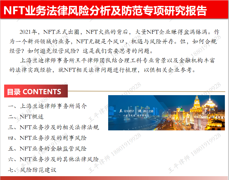 上海蘭迪律師事務(wù)所王平律師團(tuán)隊(duì)結(jié)合理工科專業(yè)背景以及金融機(jī)構(gòu)豐富的法律實(shí)踐經(jīng)驗(yàn),就NFT相關(guān)法律問題進(jìn)行梳理,以供相關(guān)企業(yè)參考。