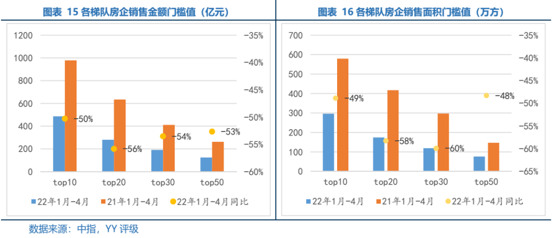 銷售門檻值方面,2022年1-4月全國TOP10-50房企銷售金額同比下滑50%至53%不等,中間檔房企銷售門檻下滑更為嚴峻。
