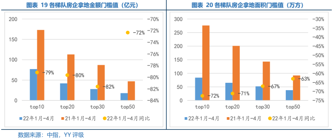 1-4月份行業內各梯隊銷售累計值和門檻值的下跌幅度均較1-3月份繼續加大,行業整體規模收縮的背景下,偏尾部房企可能面臨“無樓可售”的情況,而靠前隊伍中的出險房企則面臨“去化不掉”、“繼續停止拿地”的現象,行業生存環境的惡化并未改變。