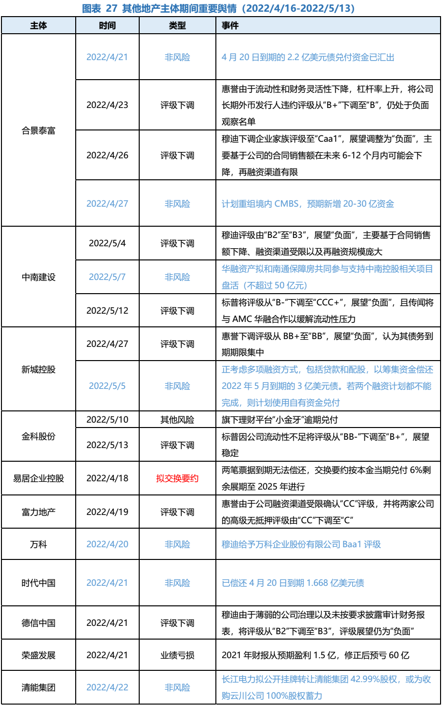 其他地產主體方面,(1)該期間,評級下調的主體有合景泰富、中南建設、新城控股、金科股份、富力地產、德信中國、佳源國際控股、紅星美凱龍、綠地控股集團等,下調原因主要為銷售端降幅明顯、流動性緊張、再融資渠道有限和債務到期期限集中等。(2)發生業績虧損事項的有:榮盛發展(2021財報修正后預虧60億)、朗詩集團(2021年度合并凈虧損-5.58億)和新希望地產(股東新希望集團2021年歸母凈利潤-13.6億元)。(3)中梁控股和易居企業控股均因流動性吃緊擬對境外債進行交換要約,其中易居企業控股主營地產數據、經紀、代理業務,表明地產行業周期向下的影響已經蔓延至服務商等地產三方服務機構。(4)還值得關注的典型事件是金科股份理財產品逾期,暴露流動性壓力冰山一角。(5)此外,新城、寶龍、遠洋和合景泰富仍在努力各項融資方式進行再融資緩解償債壓力。