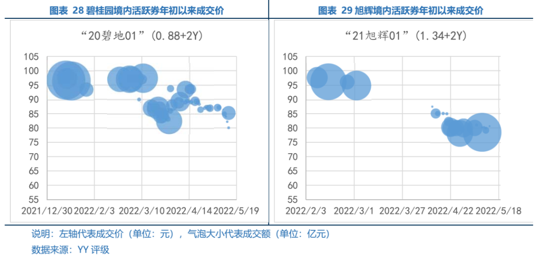 尚未展期/違約的民企方面,受行業內主體負面信用事件影響,尚未展期/違約主體的市場成交價呈下探趨勢,但不同資質主體成交價區間分層。碧桂園“福州事件”引發市場關注,“20碧地01”價格下跌至80元左右;因旭輝22年到期的境內債券均已到期償付,給予市場一定信心,“21旭輝01”自4月下旬以來成交價在80元左右徘徊;寶龍22年為債券大年,且兩度推遲披露年報,“21寶龍MTN001”由80元檔一路下跌,目前成交在54元;時代向廣州市政府懇請退地,表明舊改項目資金沉淀壓力較大,“20時代05”跌至40元檔位。