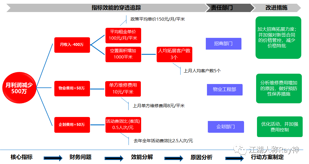 對于業(yè)務(wù)類的指標(biāo),則需要細(xì)化到開展效能分析的業(yè)務(wù)類型了。這類指標(biāo)可以是與財務(wù)指標(biāo)有直接關(guān)系的業(yè)務(wù)結(jié)果,如:簽約面積、簽約單價等;也可以是間接影響財務(wù)結(jié)果的長期行為,如:潛在客戶數(shù)量、商戶銷售額、客流等。配合衡量依據(jù),效能就還可以從其他視角進(jìn)行分析。比如:分析招商部門的人效,往往可以人均簽約面積進(jìn)行衡量;又比如:購物中心常用的坪效指標(biāo),就立足于空間所帶來的商戶銷售額轉(zhuǎn)化;再比如:在分析企劃部門的費效比時,可以從客流角度測算單位投入資金所貢獻(xiàn)的客流等等。