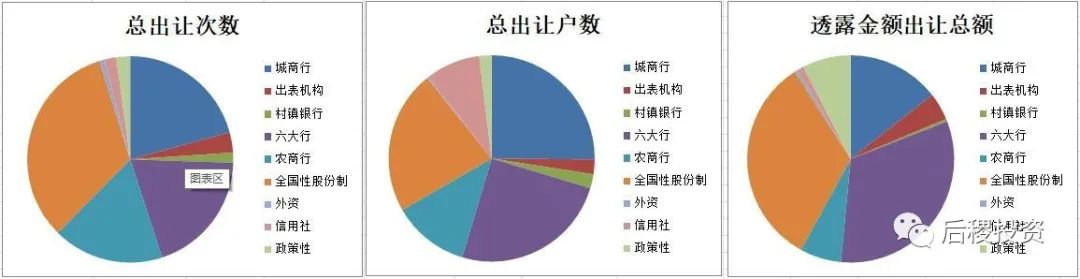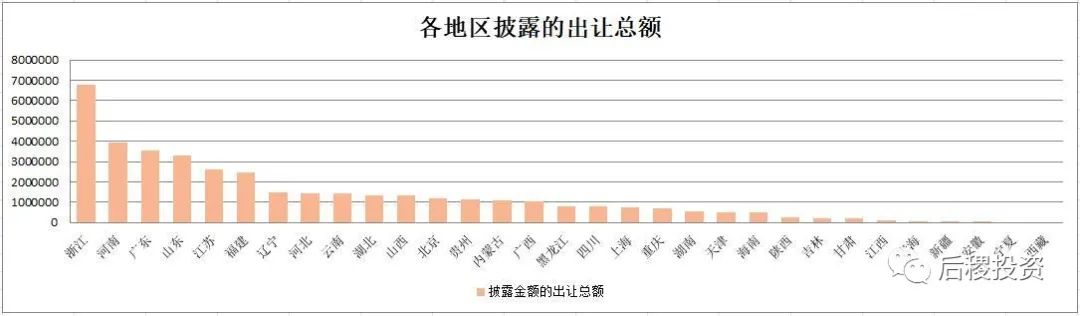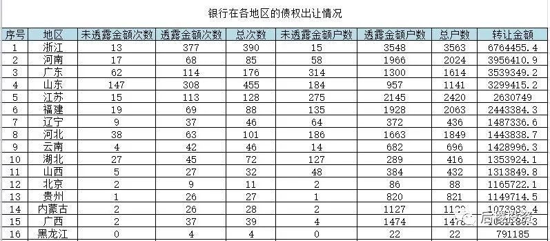 從上圖看,銀行出讓成交次數前五的省份是山東、浙江、廣東、江蘇和河北;戶數前五的省份是浙江、江蘇、福建、河南和河北,廣東排第六;而出讓總額排名前五的省份是浙江、河南、廣東、山東和江蘇,福建、遼寧、河北、山西緊隨其后,較其他地區為高。仍舊可以看出東部地區省份,銀行的出讓力度較其他地區為高,當然這也與我國的經濟總量分布有關。