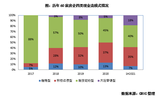 此外第四類房企,經營+投資性現金流凈額,及融資性現金流凈額均小于0,在當前環境下為風險警惕型,2021年上半年該類型房企占比達18%,這類企業未來應注意自身投拓力度及財務健康。