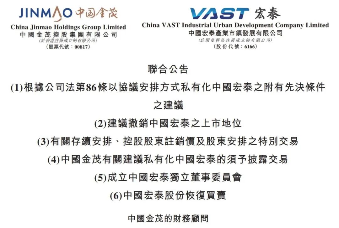 6月10日,中國金茂及中國宏泰發展發聯合公告,中國宏泰發展擬被中國金茂私有化,并撤銷中國宏泰發展股份在港交所的上市地位。