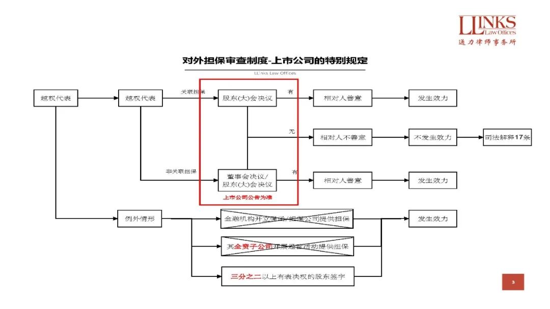 綜上,在普通公司對外擔保審查制度的基礎上,《擔保制度解釋》對上市公司提出了更高的要求,不但要求以公告為準,還幾乎排除了所有無須決議的例外情形。