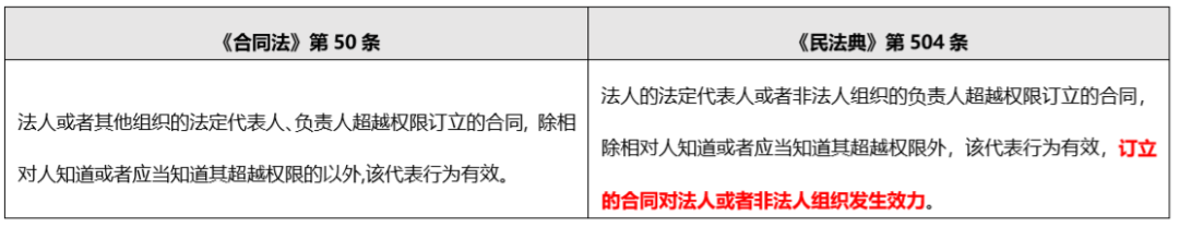 從合同無效到不發生效力, 最高院在《九民紀要》和《擔保制度解釋》中作出的轉變, 需要回歸其采用代表權限制說認定《公司法》第16條的性質進行理解。在最高院將違反《公司法》第16條的行為界定為“越權代表”, 而非違反“效力性規定”的情況下, 考慮到《合同法》第50條已經被《民法典》第504條取代, 那么未經決議的對外擔保所導致的后果也不再是“無效”而是“對公司不發生效力”。