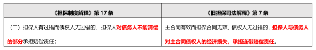 說細微, 因為《擔保制度解釋》和《舊擔保司法解釋》對擔保無效后的賠償責任所作規定, 尤其是區分的各種情況基本一致, 唯一的改動僅在主合同有效、擔保人有過錯而債權人無過錯的。