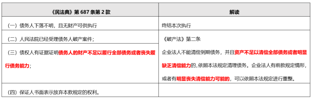 雖然《民法典》第687條第2款規定了四種例外情形, 但《民法典》的這些規定實際參考了《破產法》和執行相關的規定, 總而言之就是要證明債務人已經無法清償債務, 才能夠對抗一般保證人的先訴抗辯權。