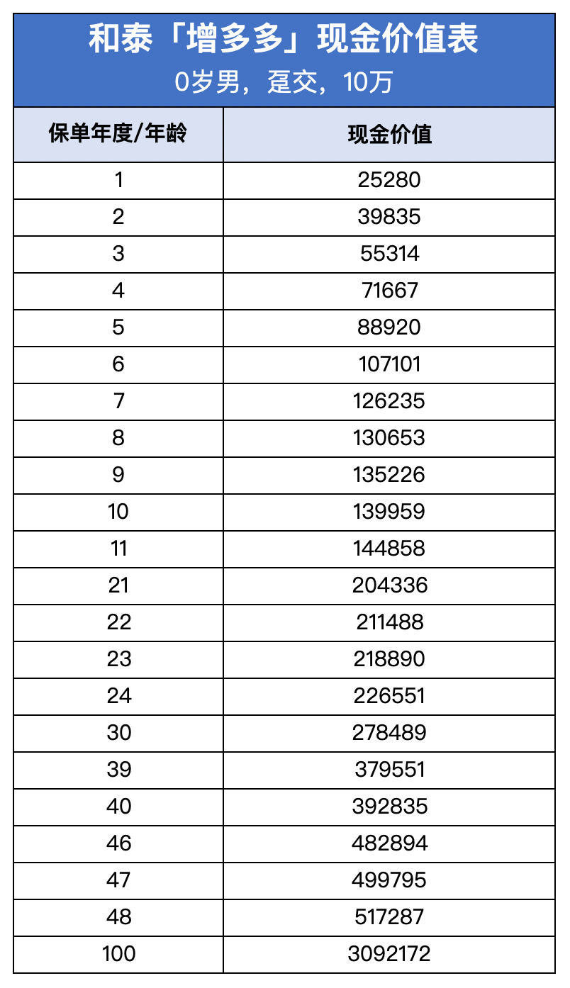 我們舉個(gè)更直觀的例子,假設(shè)老王給0歲的小王投保了增多多增額終身壽險(xiǎn),一次性交10萬(wàn)。