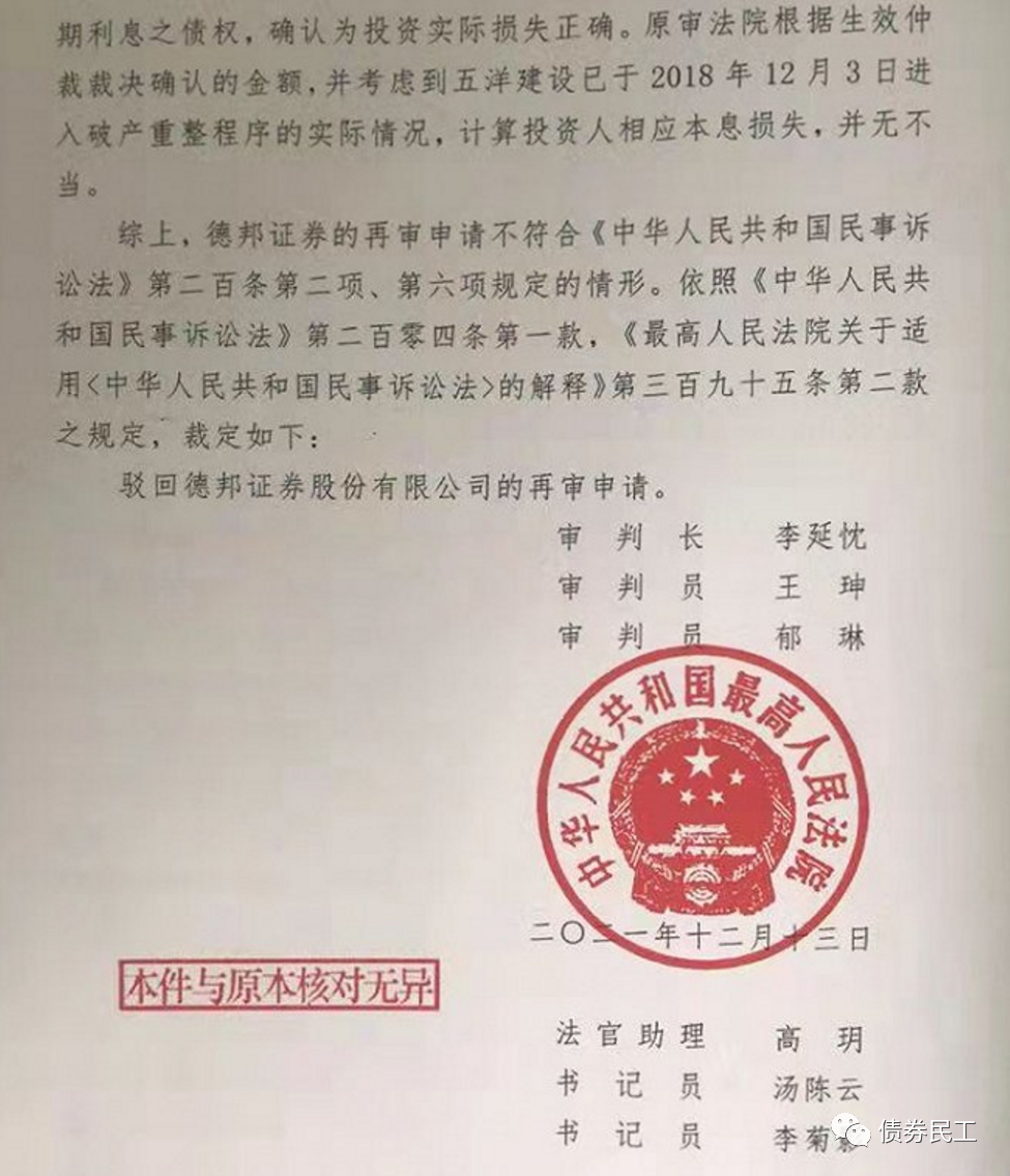 根據界面新聞2021年12月20日的報道,最高人民法院于12月13日駁回了德邦證券的“五洋債”再審申請。