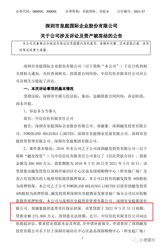 據(jù)悉,2016年皇庭國(guó)際子公司融發(fā)投資與中信信托簽訂了《信托貸款合同》,借款金額為30億元。該筆貸款已于2021年3月31日到期,貸款余額27.5億元。