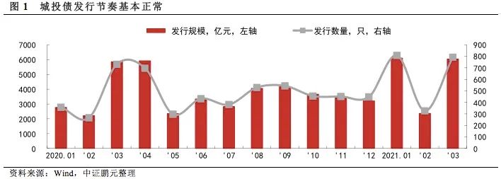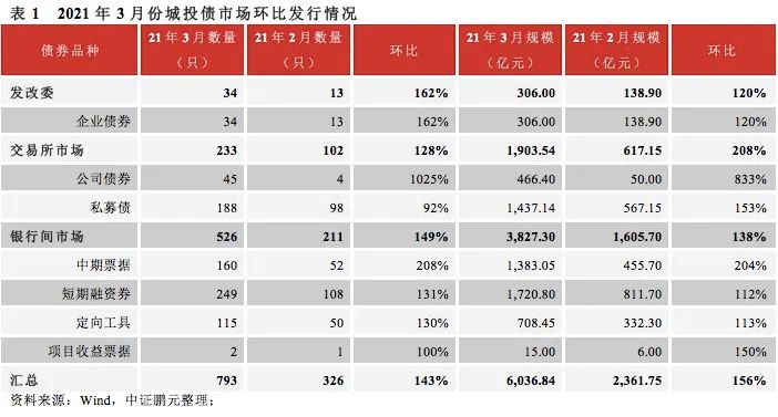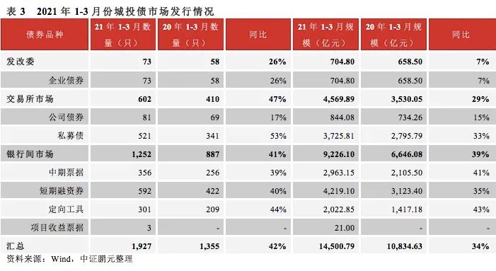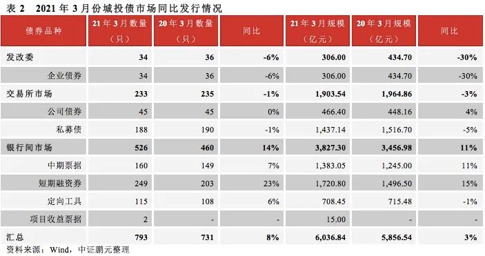 2021年3月份,各品種城投債共發行793只,發行規模6,036.84億元,較2月份發行數量和規模環比大幅度提升143%和156%,這也基本符合歷年來春節假期后城投債的發行節奏。從同比來看,2021年3月城投債發行數量同比上漲8%,發行規模同比上漲3%,較去年3月份變化不大,但由于1月份的放量發行遠超2020年同期,2021年一季度城投債發行規模同比大幅增長34%。
