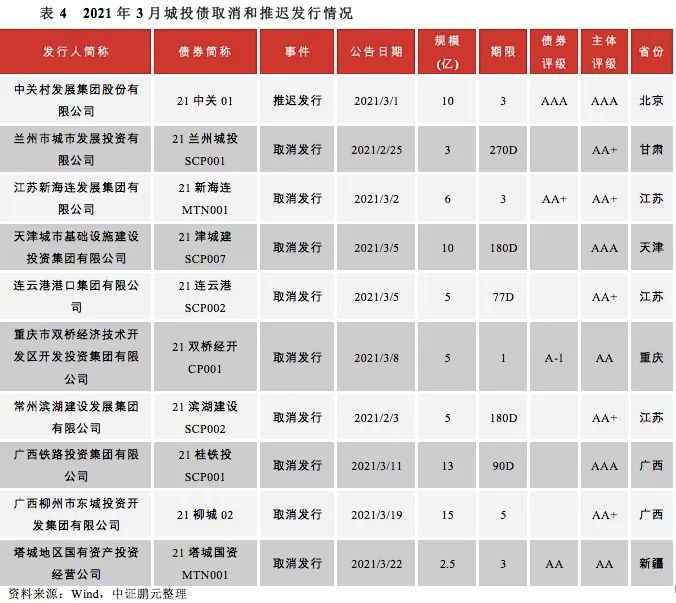3月份共有10只城投債公告取消或推遲發行,涉及發行規模74.50億元,較2月份增幅較大。同期公告推遲發行的非城投信用債共有80只,涉及發行規模515.80億元。