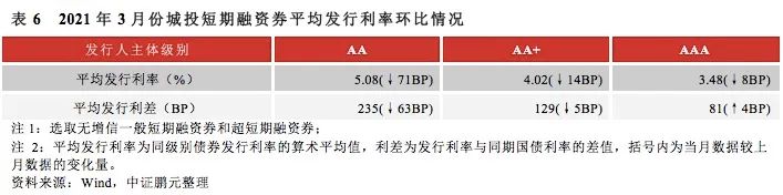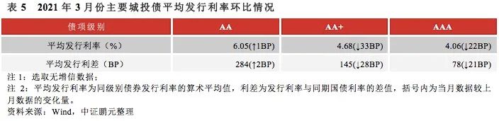高級別城投債發行利率下行:自2021年初以來,央行逐步收緊流動性并逐漸傳導至城投債一級市場,導致1月和2月份城投債發行利率整體上行,但從目前來看流動性因素基本出清,高級別城投債發行成本企穩下行。