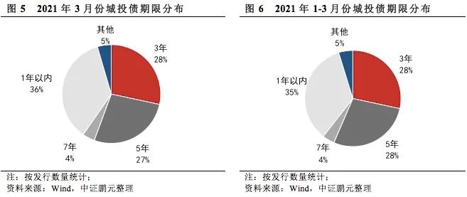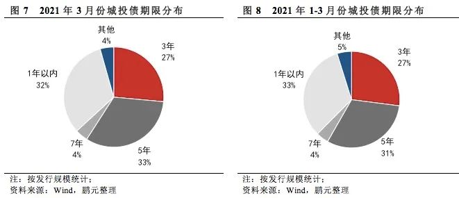 3月份城投債平均發行期限為3.13年,較2月份的3.01年延長4%。就發行數量來看,3月份發行的城投債主要是3年期、5年期以及一年以內的短期限品種。其中,3年期城投債發行225只,占比28%,發行規模1596.97億元,占比27%;5年期城投債發行216只,占比27%,發行規模1970.15億元,占比33%;一年以內短期品種發行284只,發行規模1956.72億元,占比分別為36%、32%。綜合1-3月情況來看,3年期、5年期和一年以內城投債發行數量占比分別為28%、28%、35%,發行規模占比分別為27%、31%、33%。