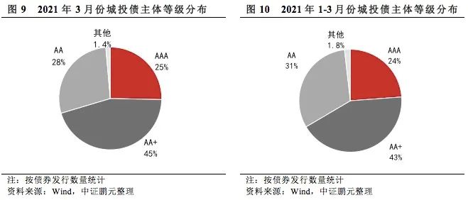 高級別主體發債占比上升,主體評級中樞明顯上移:3月份,發行主體在AA+級及以上的城投債占比合計為70%,較上月增長6.3個百分點,主體信用級別中樞大幅上移。綜合1-3月份情況來看,發行主體在AA+級(含)以上等級的城投債合計占比67%,與2020年主體級別中樞持平。