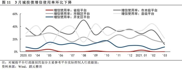 城投債增信使用率環比下降,城投債融資環境較好:3月份,城投債總體增信使用率為11.85%,較2月份環比下降6.1個百分點。就不同行政級別的主體來看,3月份除開發區平臺的增信使用率有所上升以外,其他級別城投平臺的增信使用率均環比下降。由數據可知,2020年末城投債融資環境整體較好。