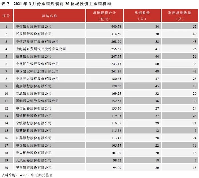 2021年3月,共有112家機構參與了城投債的承銷工作,較上月增加10家。總體來看,銀行類機構的排名較為領先。就承銷規模而言,中信銀行以440.78億元的承銷規模位居第一,連續三個月蟬聯榜首;興業銀行承銷規模314.50億元,連續三個月位居第二,中信建投證券以268.70億元的承銷規模位居第三。承銷規模前二十位的機構中,券商類機構共有7家,較2月份增加2家,且排名整體有所上升。除中信建投證券排名券商第一位,總排名第三位以外,國泰君安證券、中信證券、海通證券、浙商證券、光大證券和天風證券分別位列第11、12、13、15、18和19位。