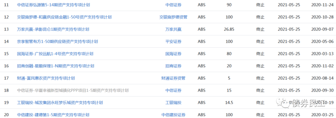 從本次終止的ABS的產品類型來看,包括供應鏈金融資產證券化產品、保理資產證券化產品、PPP項目資產證券化產品、疫情防控ABS等各種類型的資產證券化產品。