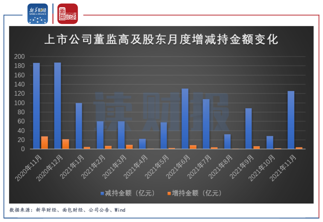新華財(cái)經(jīng)和面包財(cái)經(jīng)根據(jù)上市公司的信披數(shù)據(jù)統(tǒng)計(jì),2021年11月,滬深兩市上市公司董監(jiān)高及其關(guān)聯(lián)人減持金額合計(jì)約125.68億元,涉及351家公司;增持金額合計(jì)約4.21億元,涉及91家公司。增、減持金額相抵之后,凈減持金額121.47億元。