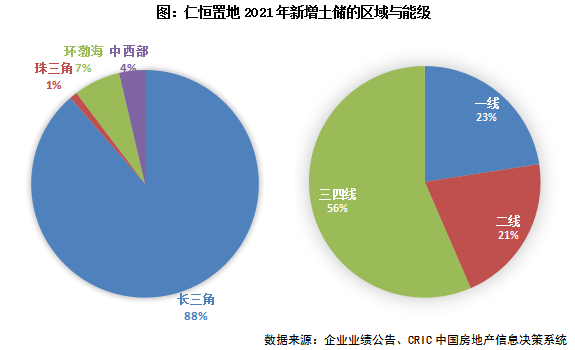 【拿地銷售比0.38,重點布局江蘇省】2021年仁恒置地新增土地儲備建筑面積124萬方,同比下降46.4%。拿地金額226.2億元,較去年同期下降12.8%。新增權益土儲金額76.4億元,僅占新增土儲金額的33.8%;全年拿地銷售比0.38。區域分布主要集中在長三角區域,拿地金額占比達到88%;能級來看三四線城市占比最高達56%,主要位于江蘇省強三線城市。