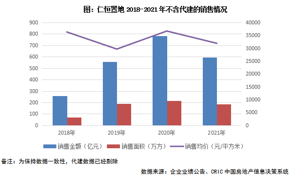 仁恒置地2021年銷售規模同比下降。2021年全年仁恒置地實現銷售金額777.12億元,較2020年同期下降13.6%。為保持數據一致性,扣除代建后仁恒置地的銷售金額為595.87億元,同比下降24%;銷售面積187萬方,同比下降12.7%。銷售均價為31890元/平方米,一方面由于仁恒置地項目一二線城市占比較高,另一方面作為一家口碑開發商,顯示了市場的認可度。但從銷售業績增速來看,銷售規模不增反降,雖然仁恒地產在規模擴張上相對謹慎,但規模收縮仍需要注意。