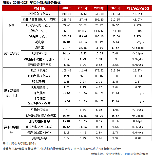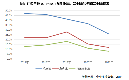 毛利率與凈利率都出現下滑。仁恒置地2021年營業收入348.33億元,同比增長45.6%;地產主業營業額310.35億元,同比增長48.1%。毛利率為25.6%,較2020年同期下降10.8個百分點。毛利率下降主要是由于仁恒重倉一二線城市,限價調控嚴格所致。另外毛利率下滑與仁恒產品線也有一定關系,近年來為了追求規模,主打高端市場的仁恒置地也開始布局剛需市場,也會對企業毛利率產生影響。凈利率11.6%,同比下降3.7個百分點;歸母凈利率7.6%,同比下降3.2個百分點。