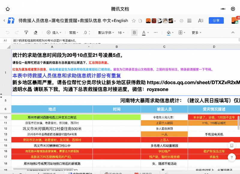 在當(dāng)?shù)財嚯姟⑼ㄓ嵅粫?、救援信息難以迅速傳遞的情況下,一個名為“救援互助信息登記模版”的騰訊文檔在網(wǎng)上刷屏。這個文檔由上海一所高校研究生創(chuàng)建,短短一天多時間,文檔登記了超過1000條求助信息,包含姓名、電話、所處地點(diǎn)、當(dāng)前情況等信息,訪問量達(dá)250多萬次,當(dāng)?shù)鼐仍块T根據(jù)文檔信息,開展了快速救援。