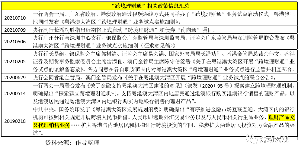 2021年9月10日,一行兩會一局、廣東省政府、港澳政府舉辦“跨境理財通”業(yè)務(wù)試點啟動儀式,同時粵港澳三地亦同時發(fā)布了《粵港澳大灣區(qū)“跨境理財通”業(yè)務(wù)試點實施細(xì)則》,意味著自今年5月6日發(fā)布征求意見稿以來,跨境理財通業(yè)務(wù)已經(jīng)進(jìn)入實操環(huán)節(jié),即大灣區(qū)內(nèi)的投資者可通過當(dāng)?shù)劂y行跨境購買對方銀行銷售的合資格投資產(chǎn)品。這是繼針對股市的滬深港通(分為北向通和南向通)、針對債市的北向債券通(南向債券通也即將啟動)、基金互認(rèn)以及開展港澳代理見證開立內(nèi)地個人銀行賬戶試點和自由貿(mào)易(FT)賬戶試點之后的又一重要舉措,意味著大灣區(qū)金融市場的互聯(lián)互通程度進(jìn)一步加深。