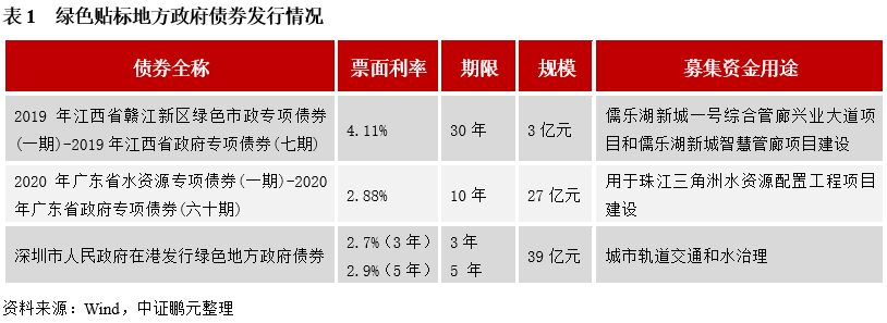 截至目前,我國發行的明確貼標“綠色”的地方政府債券僅3只,其中1只為在香港債券市場發行。2019年6月18日,江西省贛江新區發行首單貼標綠色市政債券,首期發行規模3億元,期限30年,募集資金用于儒樂湖新城一號綜合管廊興業大道項目和儒樂湖新城智慧管廊項目建設,經獨立第三方機構進行發行前評估認證,募投項目屬于節能類項目,給予綠色貼標。2020年5月12日,廣東發行了資金用于水資源配置工程的、經第三方機構進行發行前評估認證的綠色地方政府債券。2021年10月12日,深圳在香港聯合交易所發行3年期15億元、5年期24億元綠色地方政府債,募集資金將用于城市軌道交通和水治理等項目,是境內首個地方政府到香港發行離岸人民幣地方政府債券。