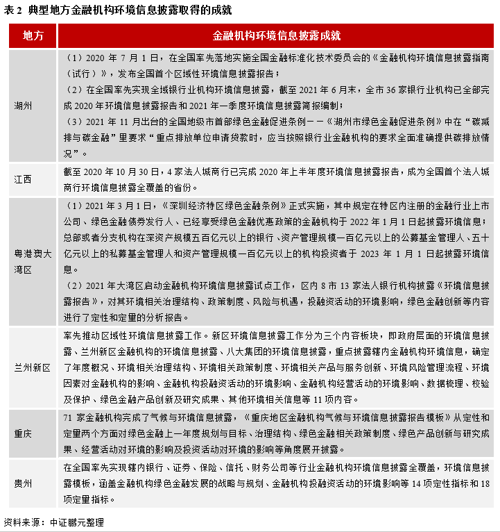 我國地方政府在綠色金融發展中發揮了“引擎”作用,一些地方政府在促進當地綠色金融發展方面做了很多努力,也制定了一系列優惠激勵政策,驅動著當地綠色金融的發展。尤其是6省9地綠色金融改革創新試驗區的地方政府,他們的綠色金融發展在全國處于領先地位。更重要的是,一些地方金融機構在綠色金融產品創新、環境信息披露方面都積累了寶貴經驗,這其中,銀行的綠色金融參與度是最高的,截至2021年6月末,全國有7家“赤道銀行”,分別為興業銀行、江蘇銀行、湖州銀行、重慶農村商業銀行、綿陽市商業銀行、貴州銀行、重慶銀行。環境信息披露方面,目前湖州、蘭州新區、重慶、貴州等地已經實現區域內銀行等金融機構環境信息披露,環境信息涵蓋了金融機構環境相關治理結構、自身經營活動的環境影響和投融資活動的環境影響等。