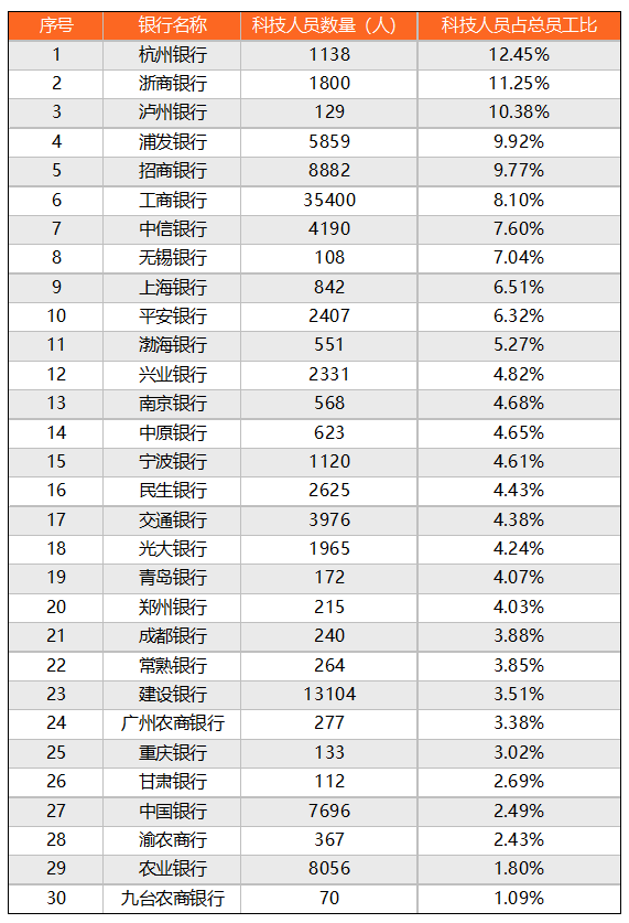 原標(biāo)題: 最高占比12.45%!30家上市銀行科技人員PK