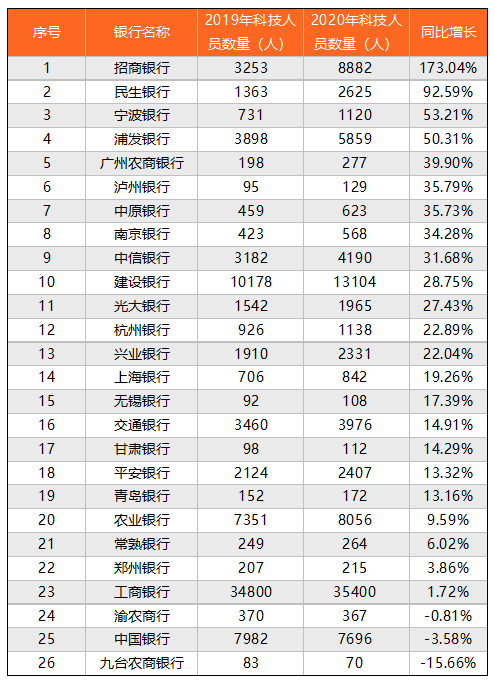 在26家銀行中,有23家科技人員數(shù)量出現(xiàn)增長,同比增長最快的是招商銀行,同比增長173.04%,科技人員數(shù)量將近翻了兩倍,此外民生銀行、寧波銀行、浦發(fā)銀行的增長率均超過50%。三家銀行出現(xiàn)同比下降,分別為渝農(nóng)商行、中國銀行和九臺農(nóng)商銀行,其中中國銀行科技人員減少286人。