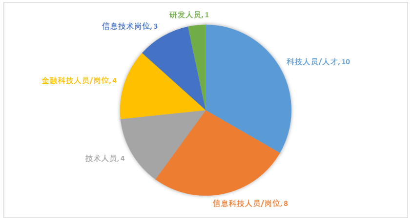 在30家披露了科技崗位的具體人員數(shù)據(jù)情況中,各家銀行對于科技崗位的命名均有所差異。零壹智庫對類似的名稱做了統(tǒng)一,如瀘州銀行使用的“科技人才”、渝農(nóng)商行使用的“全職科技人才”統(tǒng)一歸類為“科技人員/人才”。經(jīng)統(tǒng)計,使用最多的是“科技人員/人才”這一名稱,共有10家銀行使用,幾乎都為股份制商業(yè)銀行或者城商行。而國有銀行中有三家使用的是“金融科技人員”這一名稱,分別為交通銀行、工商銀行和建設(shè)銀行。而“研發(fā)人員”這一崗位名稱僅有招商銀行使用。下圖顯示了具體分布情況: