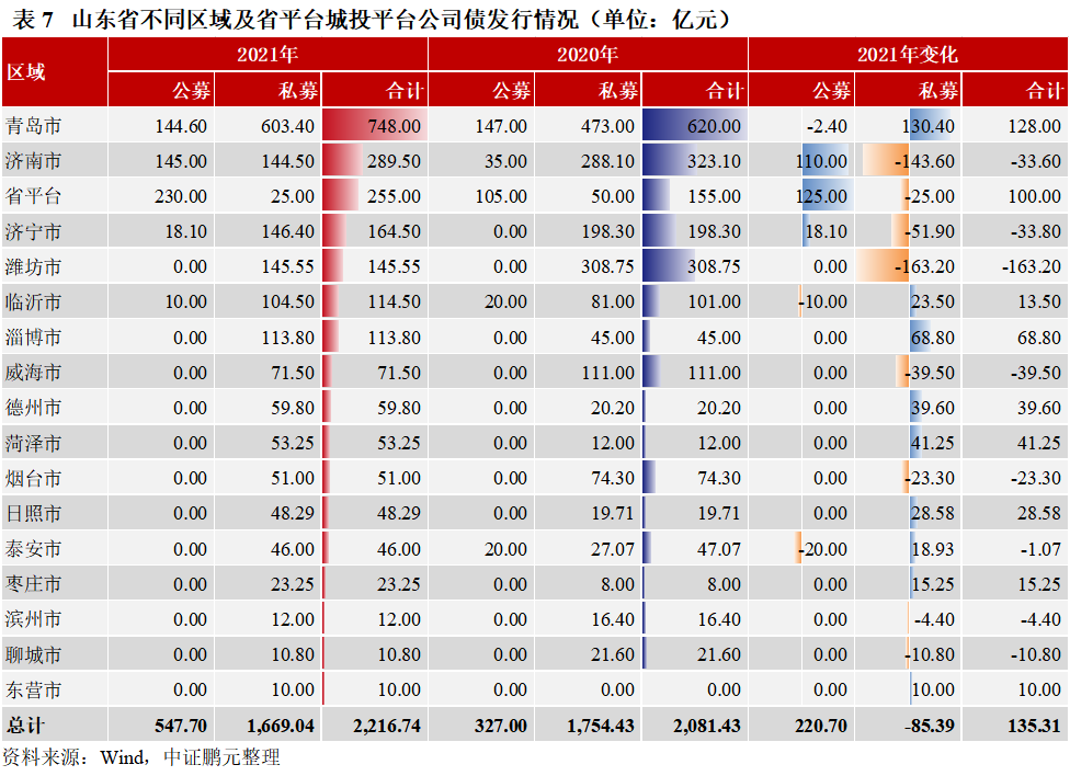(1)山東省2021年城投債發債總量保持增長,區域分化明顯。2021年山東城投發債規模和凈融資額均較2020年有所增加但增速放緩,同時季度波動明顯。青島、濟南等實力較強區域發行仍然活躍,“網紅”區域有所收縮。