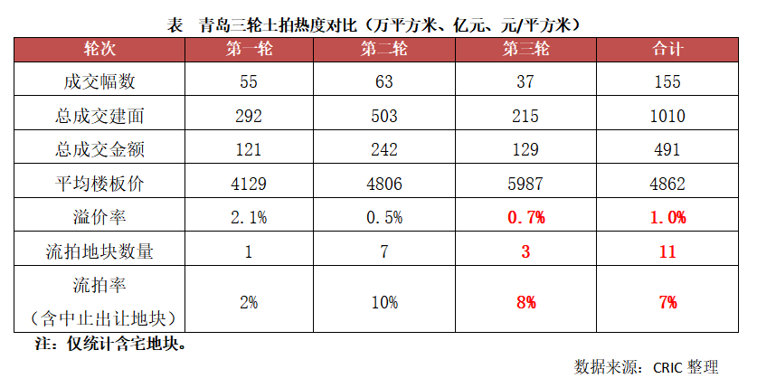 青島三輪集中土拍均保持相對穩定:溢價率維持低位,流拍現象較其他城市也相對溫和。