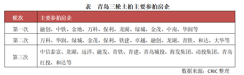 二輪集中成交地塊則基本被本土企業競得。成交的63宗宅地中七成以上均被本土房企競得,不過金茂、中鐵建、華潤、萬科、保利發展和融創等多家房企也均有落子。這些企業在青島首輪集中土拍中也均有布局,未來將進一步深耕青島。