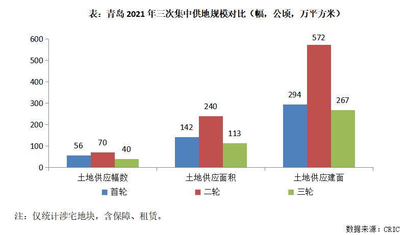 從土地供應規模上來看,青島三輪集中土拍供應宅地40宗宅地,總供應建面267萬平方米,規模上來看,不及二輪半數,也不及首輪。截止12月15日,2021年青島市區宅地累計供應量達792公頃,而2021年度青島市區住宅用地計劃供應806公頃,從供應角度來看,供地完成度達98%,基本完成了全年宅地計劃供應量。