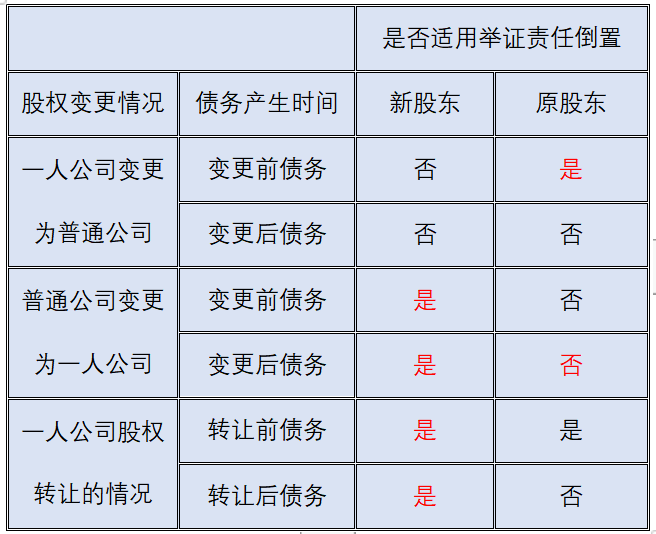另外,對(duì)于變更為普通公司后新加入的股東,以及變更為普通公司后新產(chǎn)生的債務(wù)。一方面,因?yàn)樾鹿蓶|加入時(shí),其利用一人公司的特殊治理結(jié)構(gòu)隨意支配公司財(cái)產(chǎn)的客觀條件已不存在;另一方面,也不存在債權(quán)人會(huì)基于公司之前的登記公示信息而對(duì)公司當(dāng)下的償債能力產(chǎn)生合理預(yù)期的可能。因此,對(duì)于新加入的股東以及變更為普通公司后新產(chǎn)生的債務(wù),股東無需因舉證責(zé)任倒置而承擔(dān)連帶清償責(zé)任。