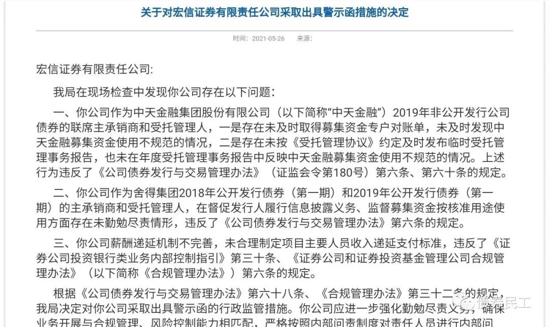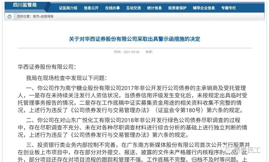 根據(jù)中國(guó)證監(jiān)會(huì)四川監(jiān)管局于2021年5月26日披露的公開(kāi)信息,華西證券股份有限公司和宏信證券有限責(zé)任公司被出具警示函措施,其中債券存續(xù)期受托管理問(wèn)題是很重要的被處罰原因。