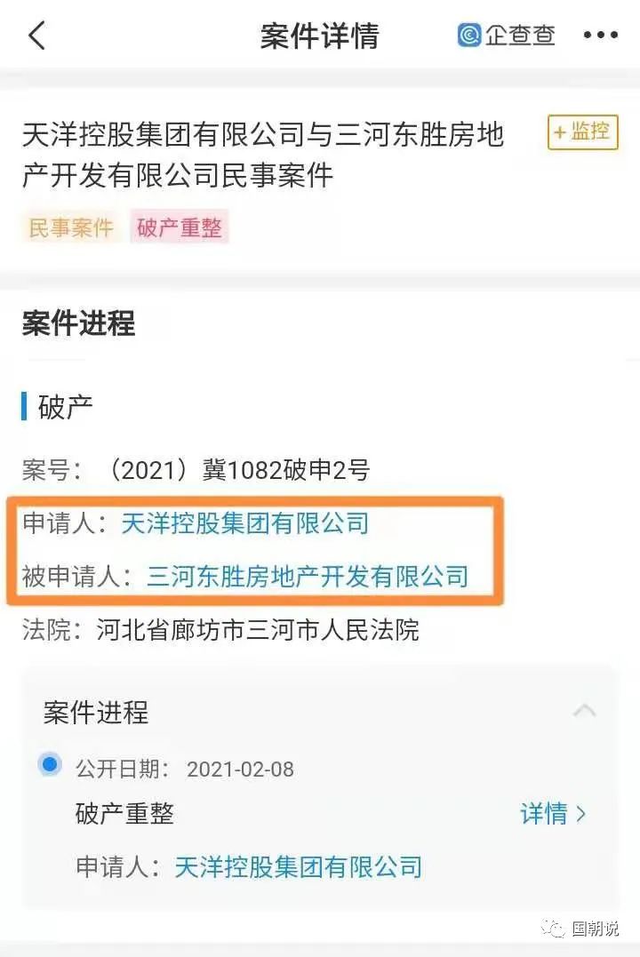 根據(jù)查詢,融資方三河東勝房地產(chǎn)開發(fā)有限公司已經(jīng)被申請破產(chǎn)重整。