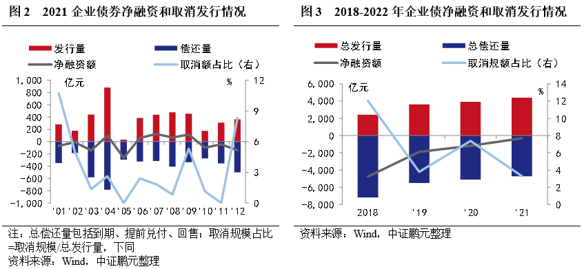 從凈融資情況來看,2021年企業債券總發行規模4,399.40億元,總償還規模4,707.55億元,凈融資-308.15億元,上年同期為-1,182.03億元。此外,2021年有23只企業債券取消發行,原計劃發行規模145.10億元,其中,有12只債券已擇期在年內成功發行,發行規模113億元。從償還類型看,2021年企業債以到期償還和提前兌付為主,占比分別為46%和49%,回售規模占比5%,較上年增長4個百分點。2021年全額回售實現提前到期摘牌的企業債有92只,兌付規模455.64億元,較上年分別增長67%和51%。從2018年來看,企業債發行規模逐年增長,償還規模呈現遞減,凈償還規模明顯下降。同時,受市場波動和政策影響,取消發行規模也呈現一定波動,其中,2021年企業債取消規模較2020年明顯下降。