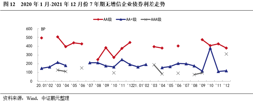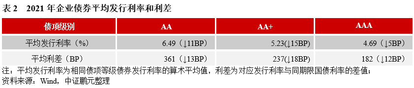 2021年,企業債券最高發行利率為8.00%,與上年下降50BP;最低發行利率為3.05%,較上年上行66BP。分債券級別來看,與上年相比,各級別企業債平均發行利均下行,平均發行利差均收窄,其中AA和AA+級較AAA級降幅較大。