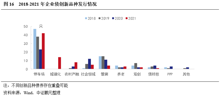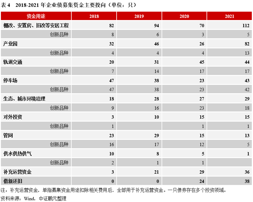 從募集資金用途看,棚改、安置房等安居工程是企業債的主要投向,占比23%左右,其次是產業園相關項目2021年出現明顯增加,數量占比17%,軌道交通和停車場項目占比也相對較高,各占9%。此外,2020年來,借新還舊和全額補充運營資金(扣除相關發行費用后)明顯增加。結合創新品種看,除停車場長期以發行專項債為主外,生態、城市環境治理領域發行創新品種的占比也較高,主要為綠色債,軌道交通和管網領域創新品種也較多,其他領域中創新品種較少。