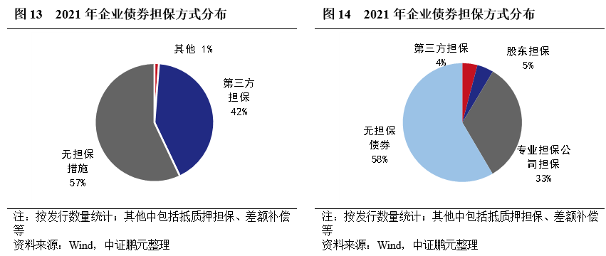 2021年,企業債有擔保的債券共計231只,數量占比43%,與上年基本持平。分主體級別看,AA級主體選擇增信發行的債券比重為82.6%,較上年上升6.1個百分點;AA+級主體選擇增信發行的債券比重為9.1%,較上年下降2.7個百分點。有擔保債券的擔保方以專業擔保公司為主,占比33%,較上年上升3個百分點。從趨勢看,2021年7月以來有增信債券占比相對平穩,11月來有所抬升。