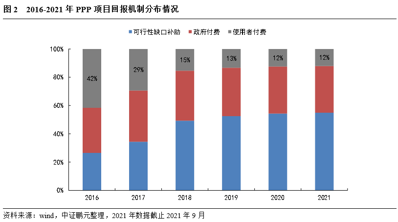PPP項目發行REITs目前存在的主要問題是滿足收入來源以使用者付費為主的項目數量較少,且實際轉讓中各類手續的合規性問題。政策要求PPP項目發行REITs的底層資產:各類手續合法合規,收入來源以使用者付費為主,項目運營穩健,未出現重大問題或合同糾紛。根據wind中PPP專題庫統計,截至2021年9月,PPP項目數13,645個,投資金額198,823.24億元,項目落地率74.73%。其中使用者付費項目個數1,654個,投資金額26,019.47億元,分別占比12%和13%,圖2可以看出,2016至20220年使用者付費項目逐年減少,2021年使用者付費項目或許回暖(截至2021年9月,今年使用者付費項目占比與去年持平,可能原因跟REITs上市,使用者付費項目關注度增加,更受青睞有關)。另外,PPP項目中需協調社會資本,項目各類手續是否齊全,是否滿足國家相關政策性文件要求,相關歷史遺留問題,均影響PPP項目發行REITs。