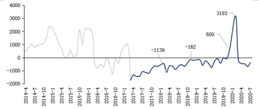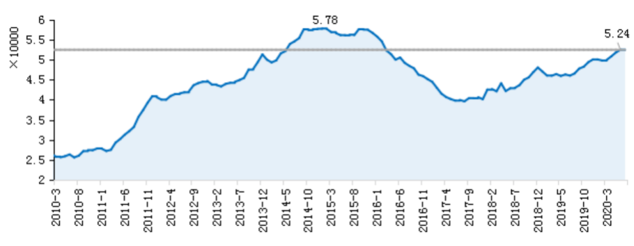 圖:2010年-2020年7月全國80個重點城市商品住宅庫存面積走勢(萬平方米)